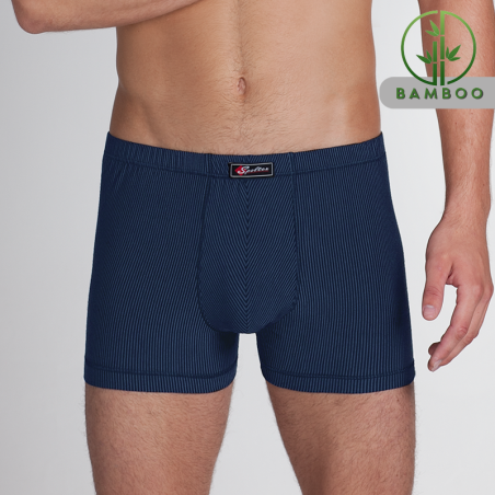 Elastické boxerky z materiálu Bambus, který je velmi příjemný na tělo a heboučký na omak. Boxerky mají náš klasický střih střední délku nohaviček a bezešvý zadní díl. Barevná kombinace - jemný černo-šedý proužek, tm.modrý-sv.modrý proužek. Materiál z bambusového vlákna zaručuje komfortní nošení, dobře odvádí vlhkost a má výborné termoregulačn vlastnosti. Tento materiál přírodního původu je měkčí než bavlna a má přirozené antibakteriální vlastnosti.